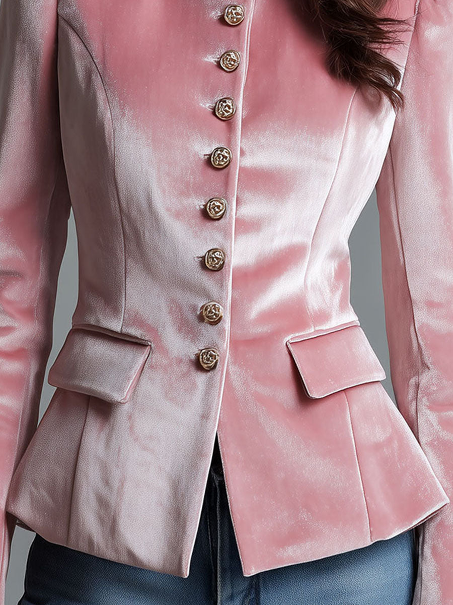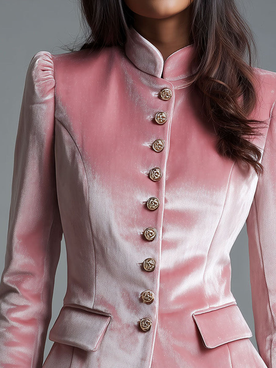 The Vintage Grace Blush Pink Velvet Military Jacket is a stunning piece that combines timeless military style with the elegance of blush pink velvet. This jacket is designed for those who appreciate both classic fashion and luxurious textures.