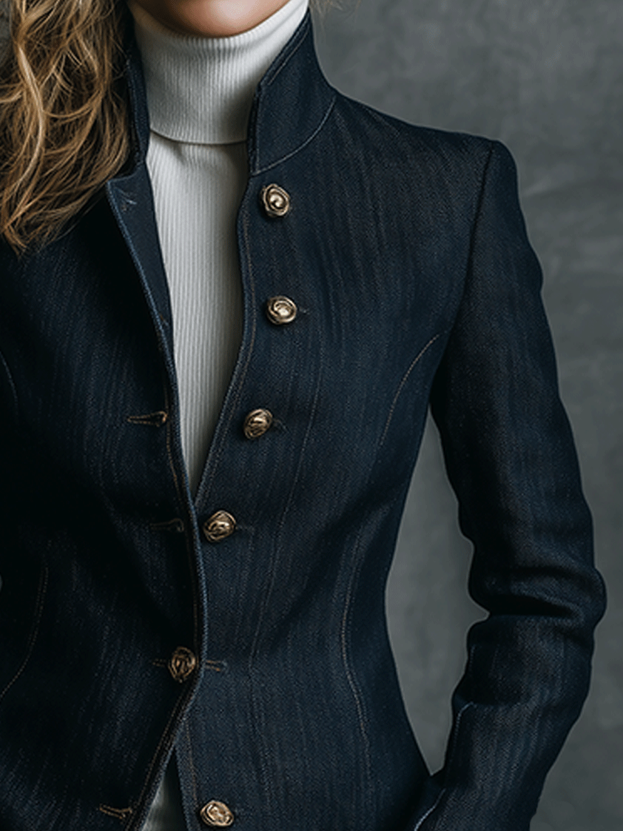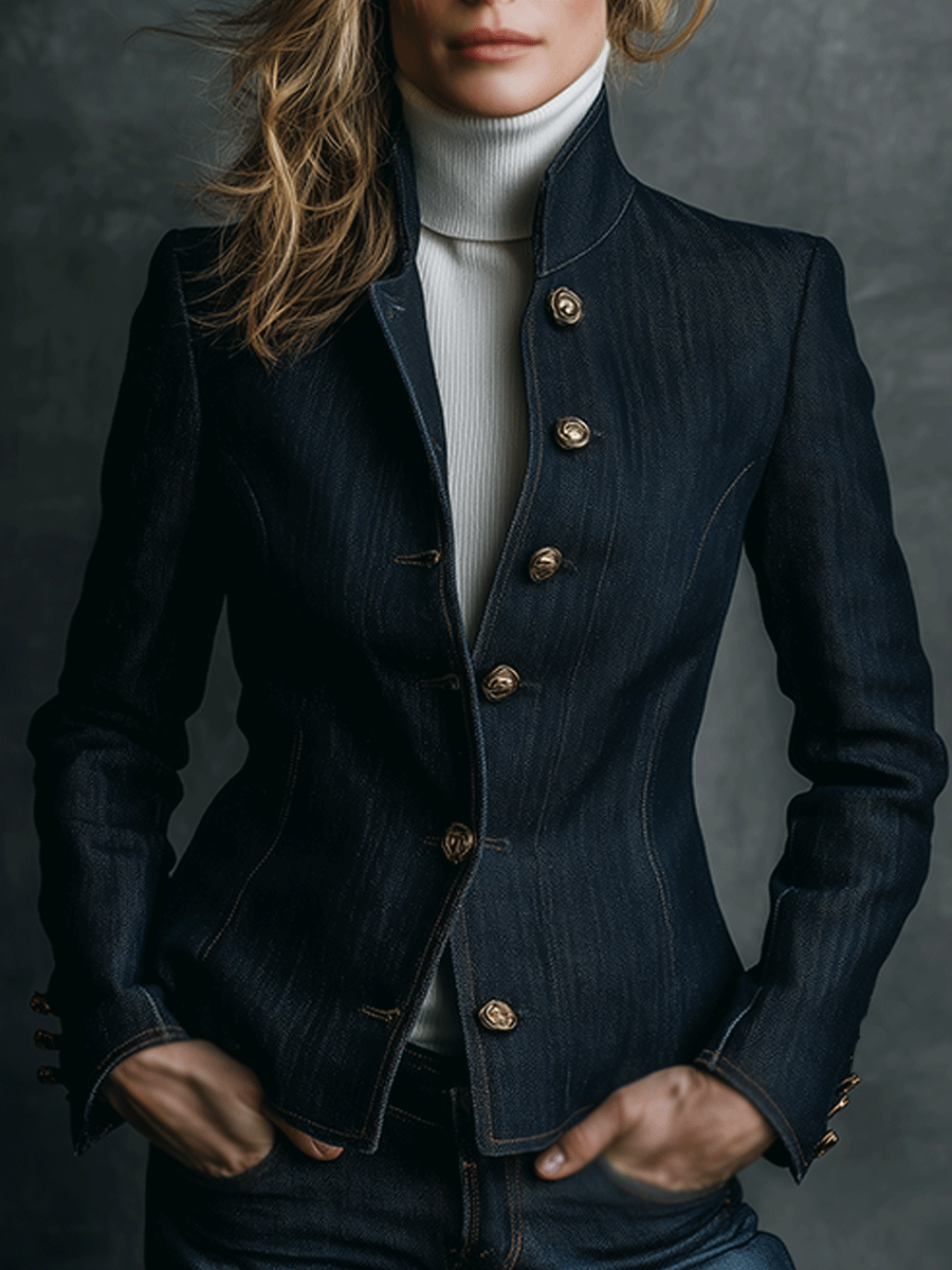 Introducing the Vintage High Collar Classic Curve Cut Denim Brass Button Jacket, a timeless addition to your wardrobe that seamlessly blends retro aesthetics with modern fashion. This jacket is crafted with the finest quality denim and designed with a unique high collar style, offering both comfort and elegance.