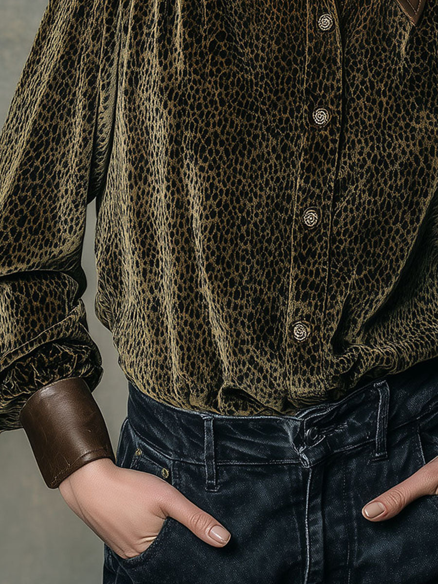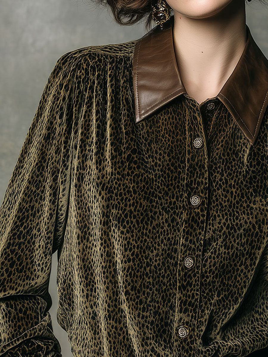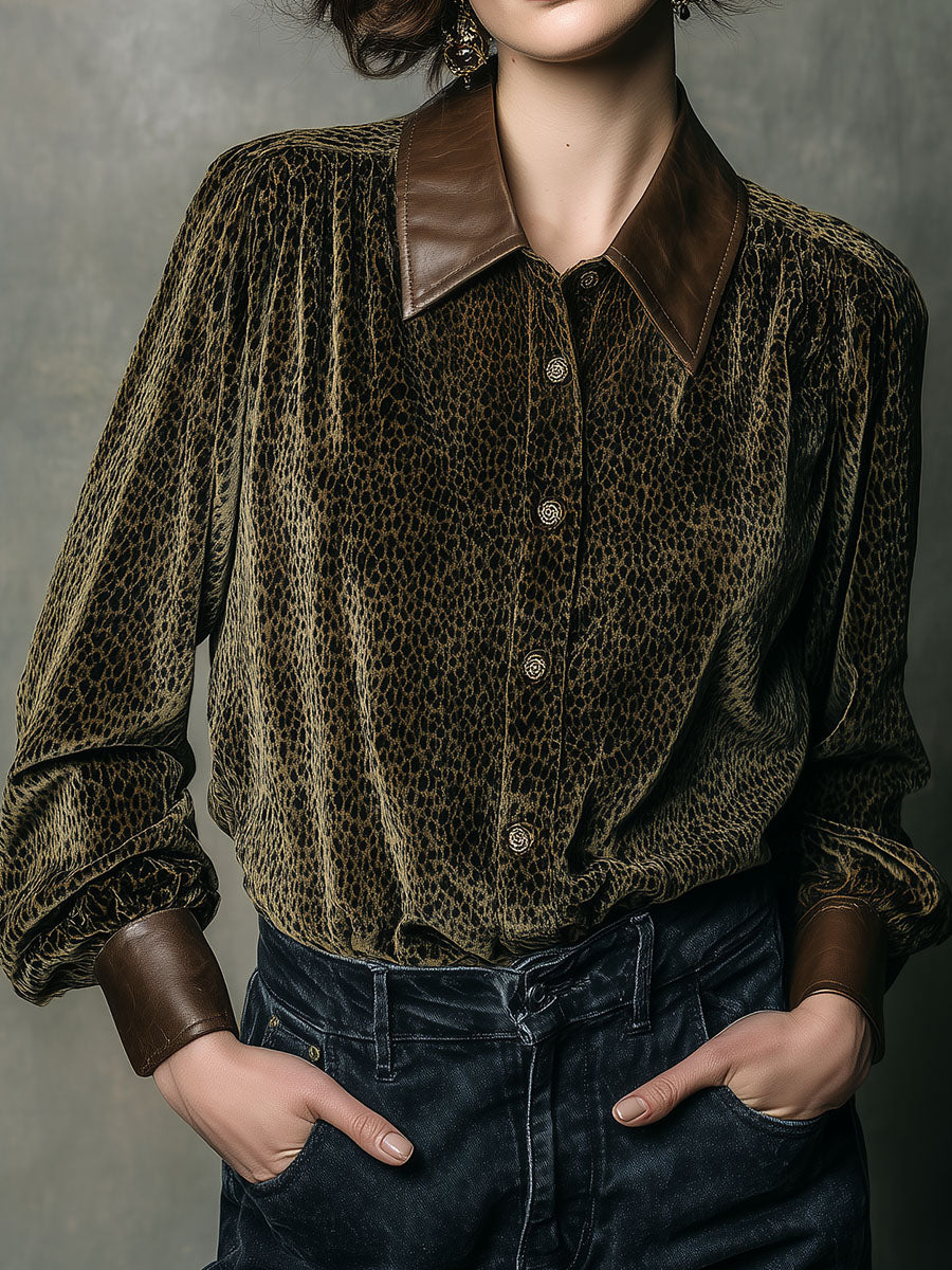 Vintage Leather Collar & Cuffs Leopard Print Velvet Button-Up Shirt
