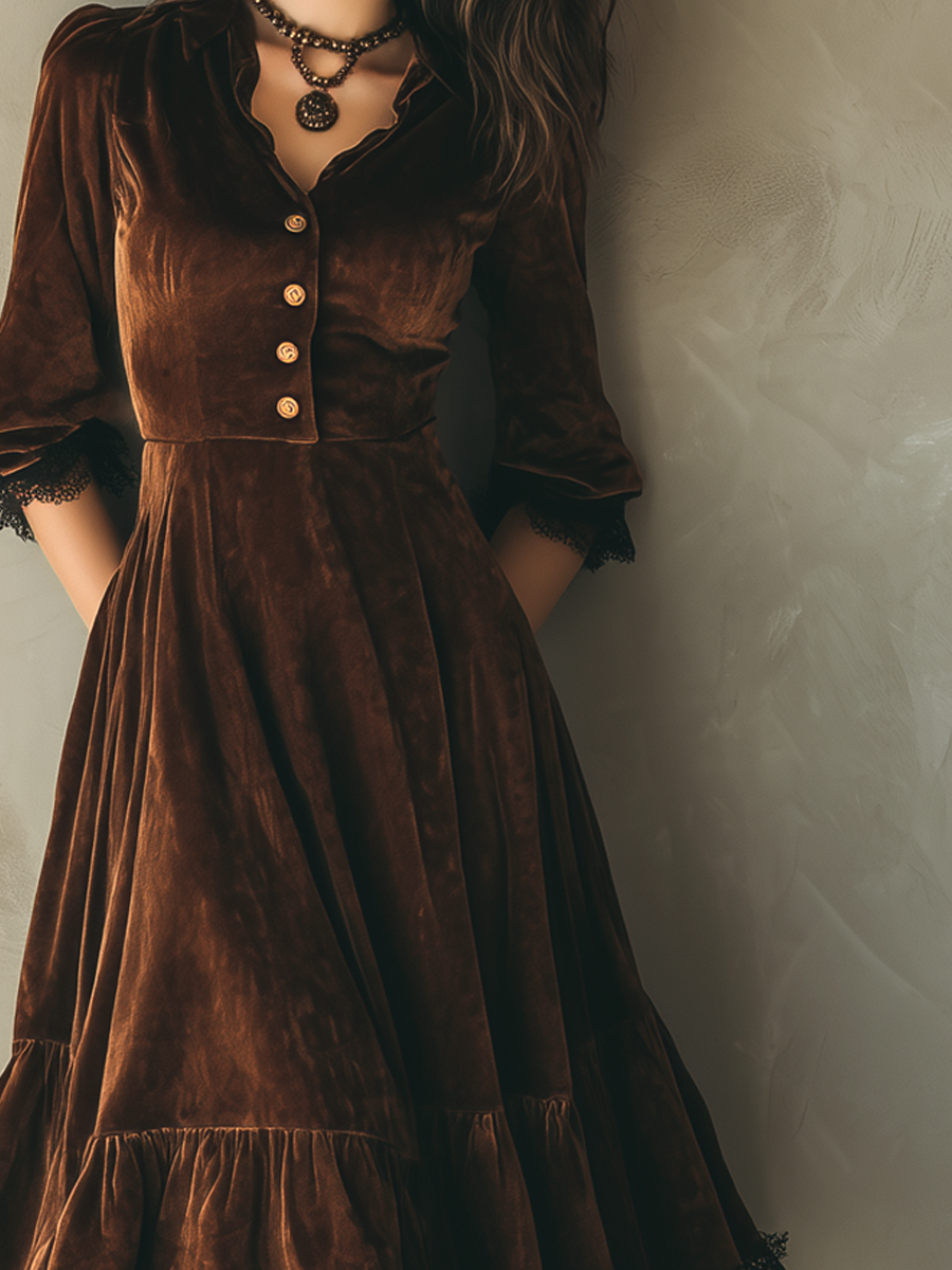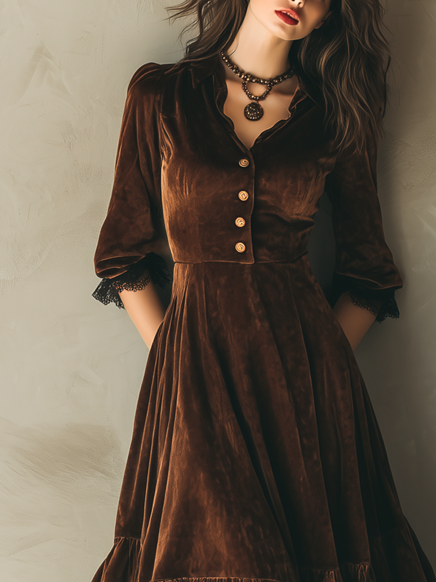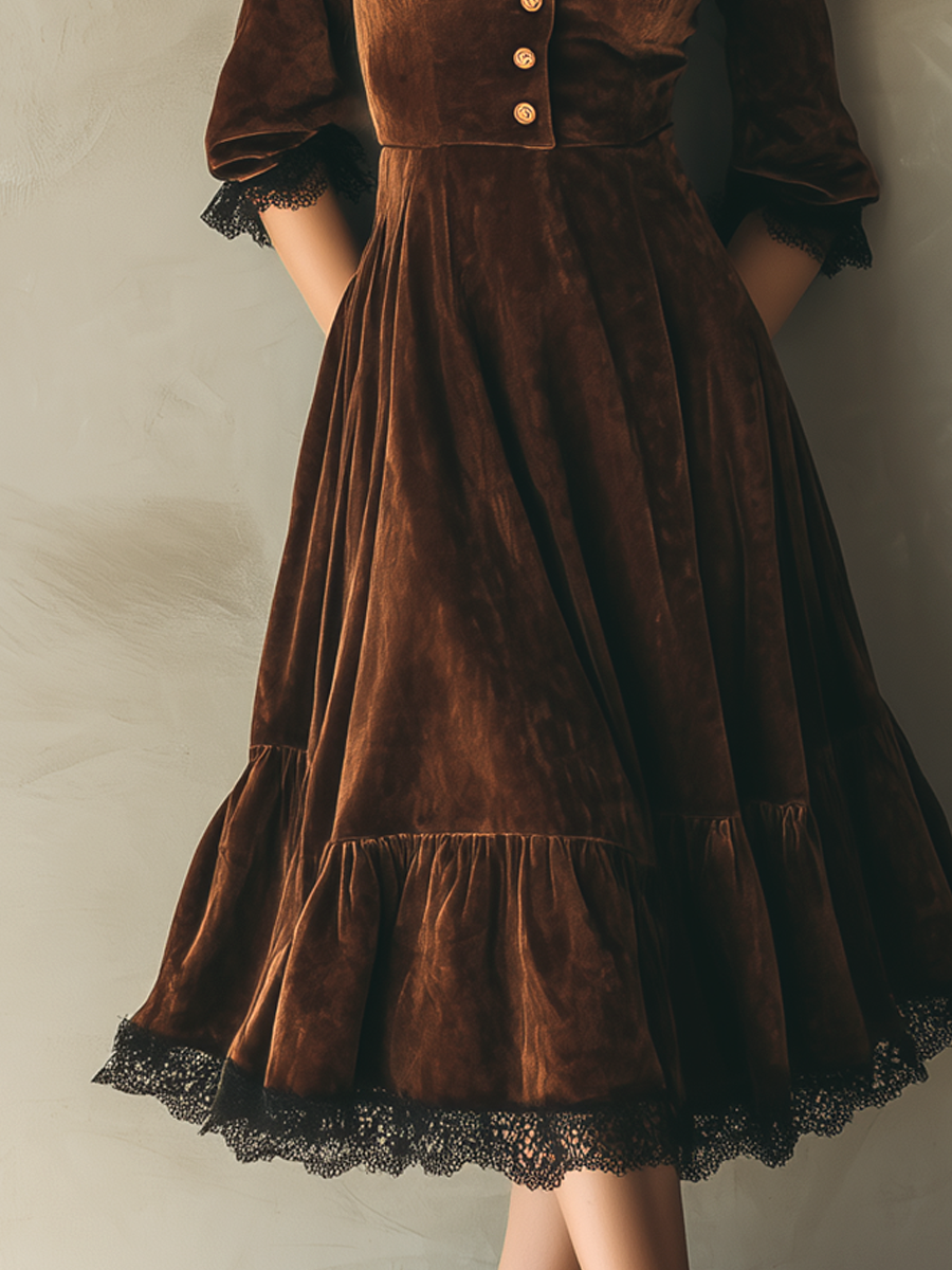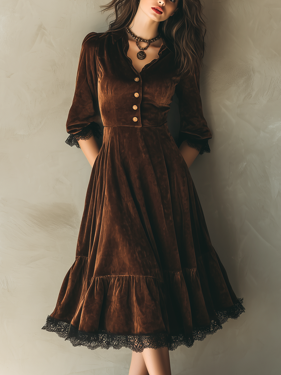 This exquisite velvet midi dress embodies a vintage charm with its intricate lace trim and distinguished metal buttons. Crafted from luxurious velvet fabric, the dress offers a plush texture and a sophisticated look, perfectly accentuating an elegant silhouette. The timeless organza lace details add a touch of delicacy and sophistication, making it a standout piece for any wardrobe.
