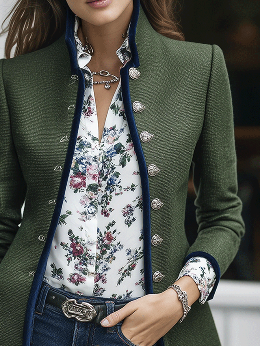 Vintage Military-Inspired Contrast Trim Green Tailored Blazer