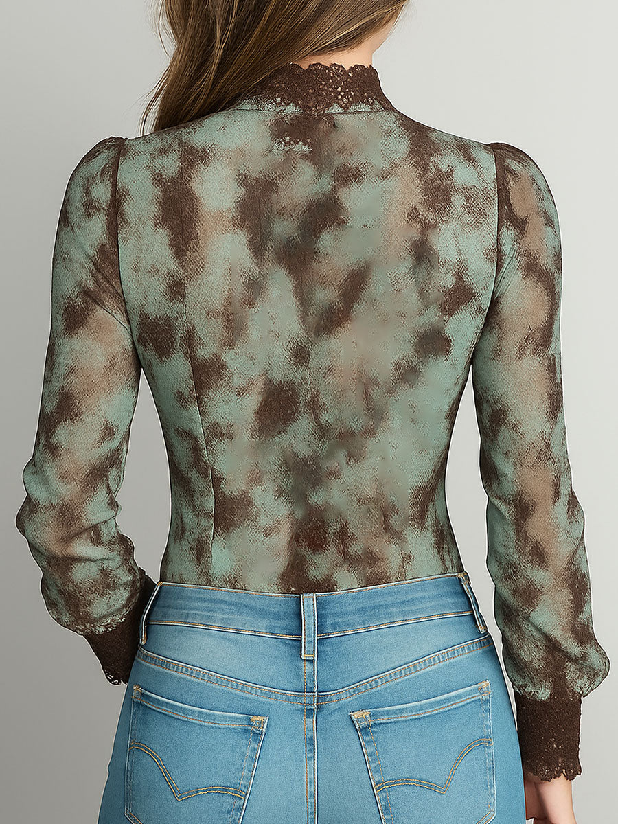 Vintage Mint Green And Brown Lace Patchwork Sheer Shirt