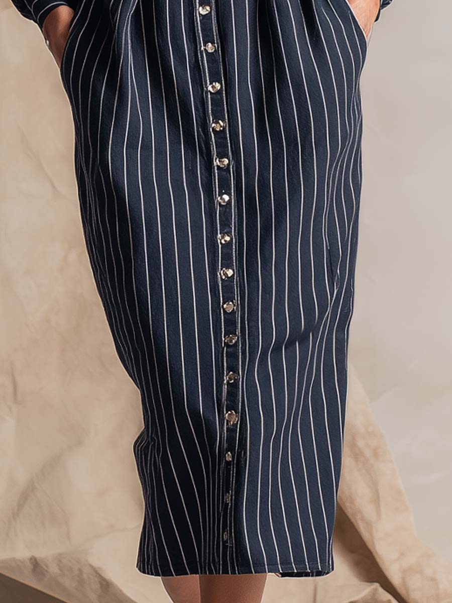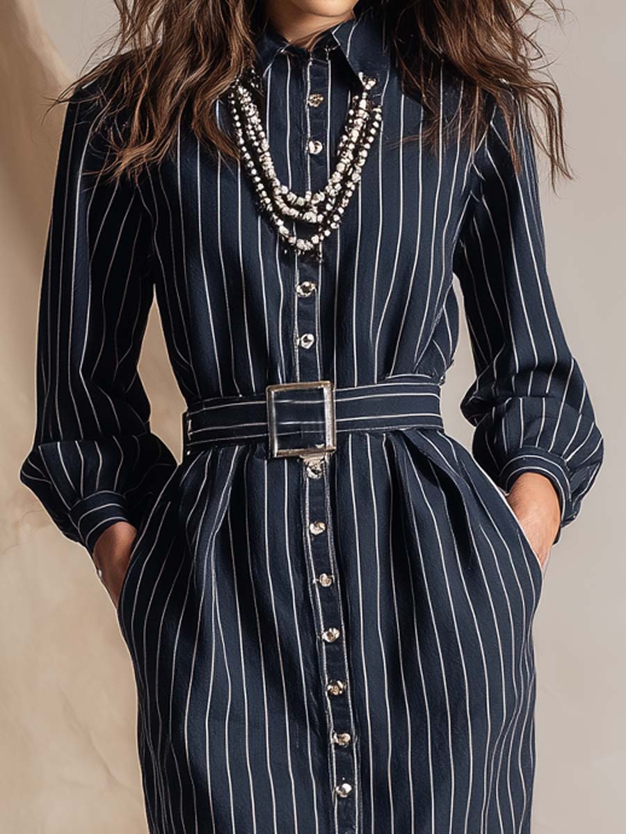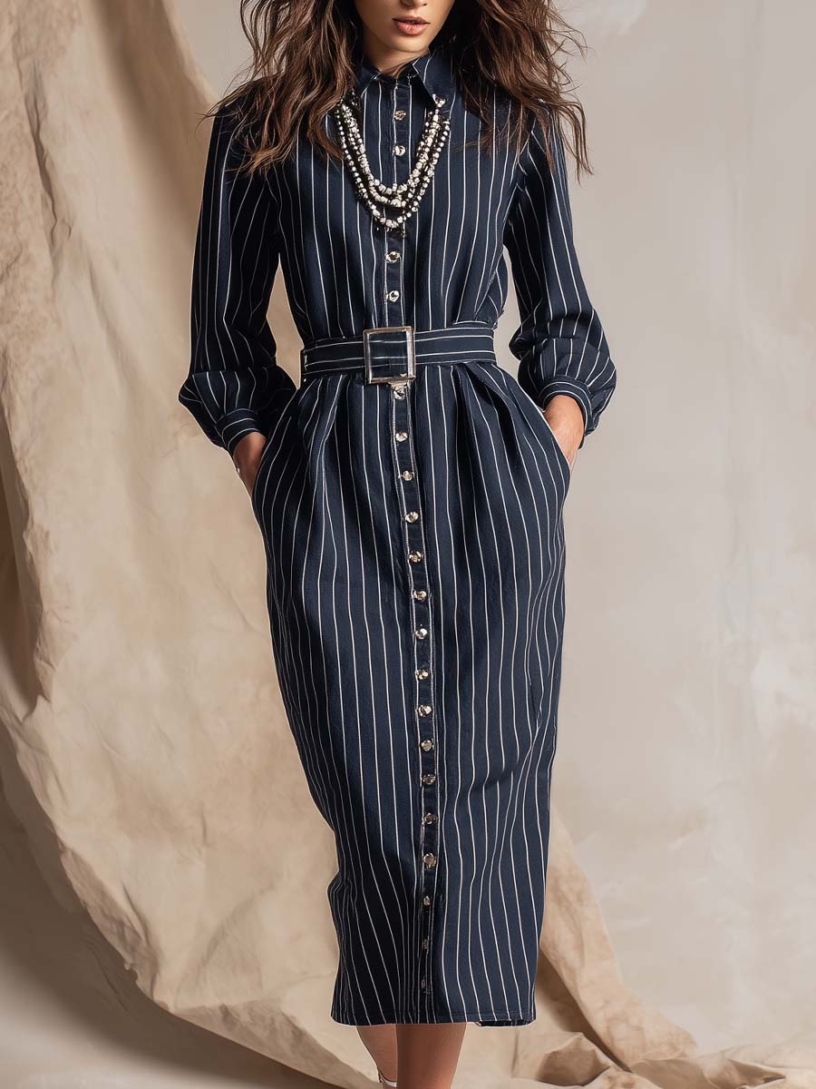 Vintage Navy Workwear Lapel Straight Belted Midi Dress