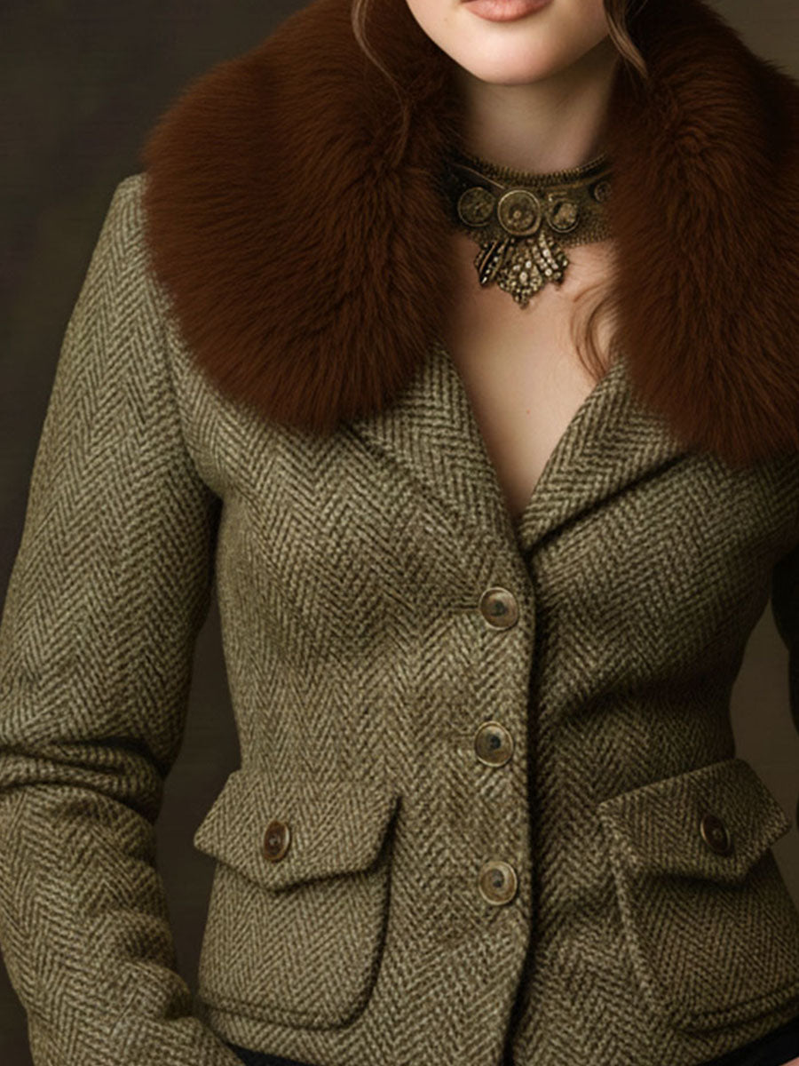 The Vintage Olive Herringbone Tweed Blazer Jacket with Eco Fur Collar is a statement piece that embodies classic elegance and modern eco-consciousness. Its unique combination of a timeless tweed pattern and sustainable materials makes it a must-have for the fashion-forward individual who values both style and the environment. Whether attending a formal event or enjoying a casual outing, this blazer offers versatility and sophistication.