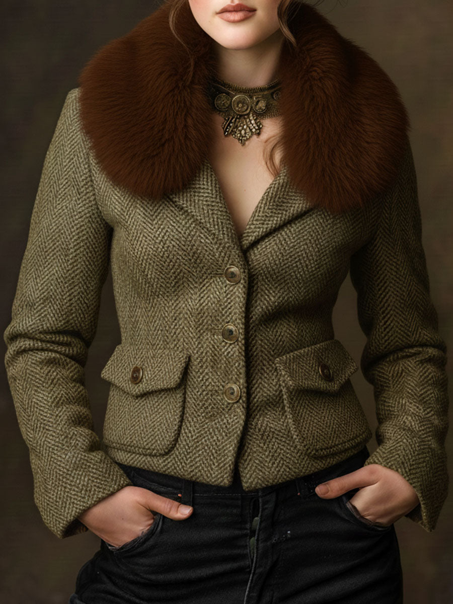 The Vintage Olive Herringbone Tweed Blazer Jacket with Eco Fur Collar is a timeless piece that effortlessly blends classic style with modern sustainability. This jacket is crafted from high-quality herringbone tweed fabric in a rich olive hue, exuding sophistication and elegance. The addition of an eco-friendly fur collar adds a touch of luxe and warmth, perfect for transitioning between seasons.