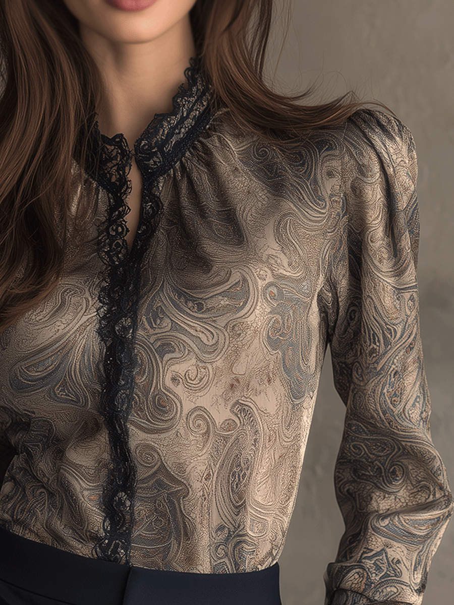 The Vintage Paisley Lace Button-Down Shirt exudes timeless elegance with its intricate blend of paisley patterns and delicate lace accents. This shirt is a testament to sophisticated vintage fashion, crafted to enhance your wardrobe with classic charm.