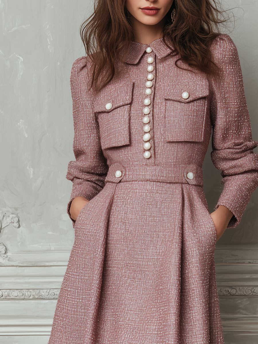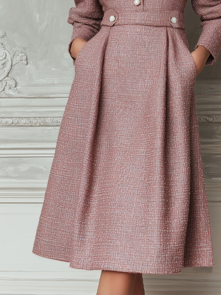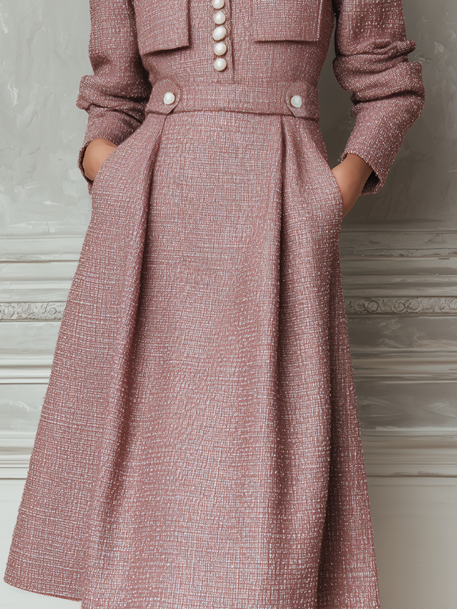 Vintage Pocket Tweed Long-Sleeved Midi Dress