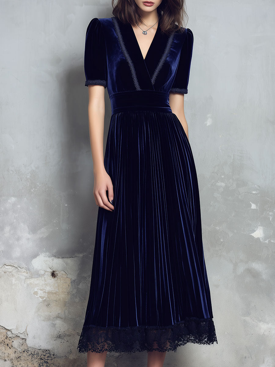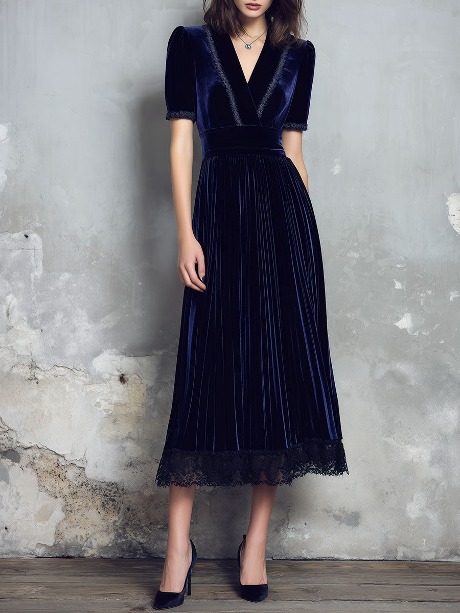 Retro Puff Sleeve Navy Velvet Lace Trim Midi Dress