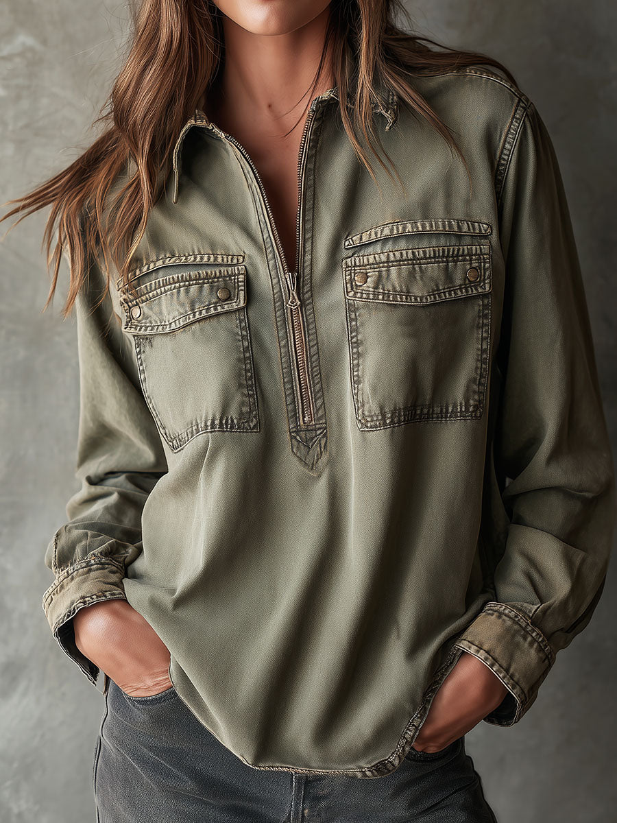 Vintage Relaxed Fit Zip-Front Washed Olive Utility Shirt