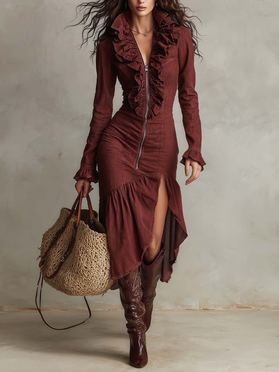 Vintage Ruffle Zip-Front Asymmetric Midi Dress