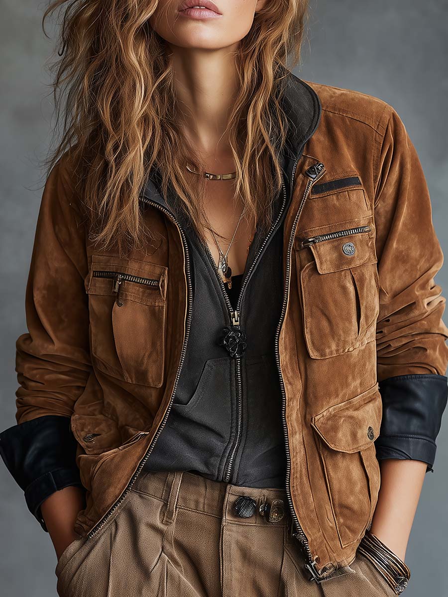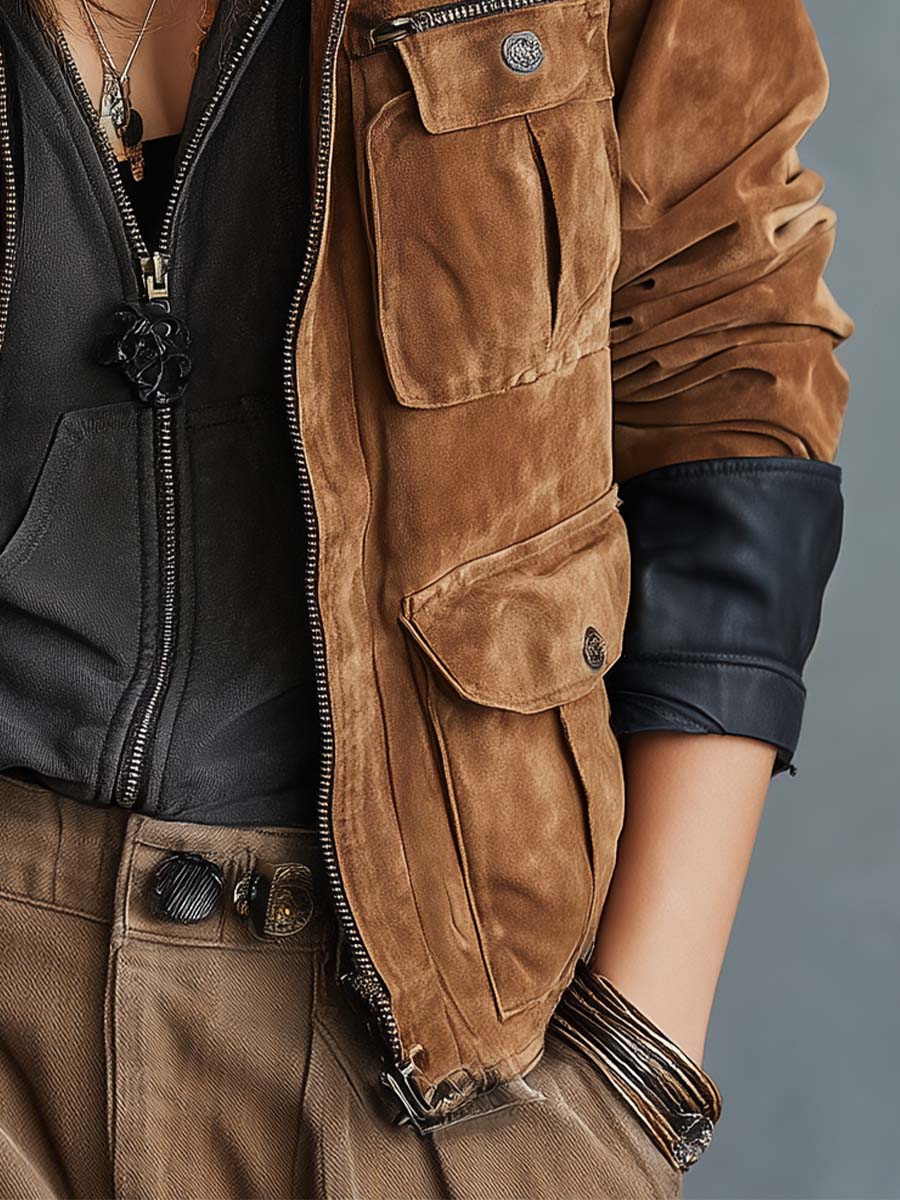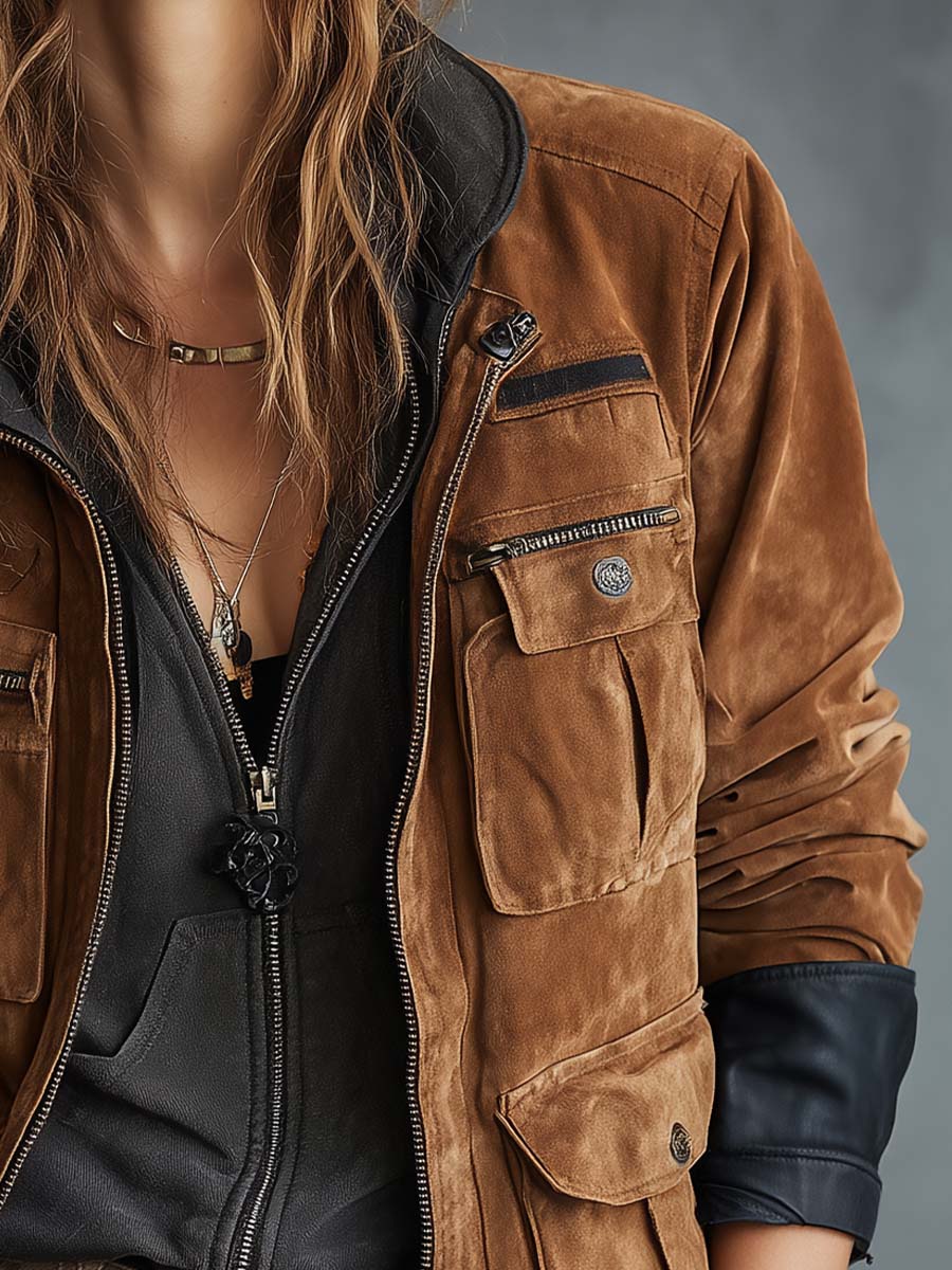 Vintage Suede Utility Jacket With Leather Trim