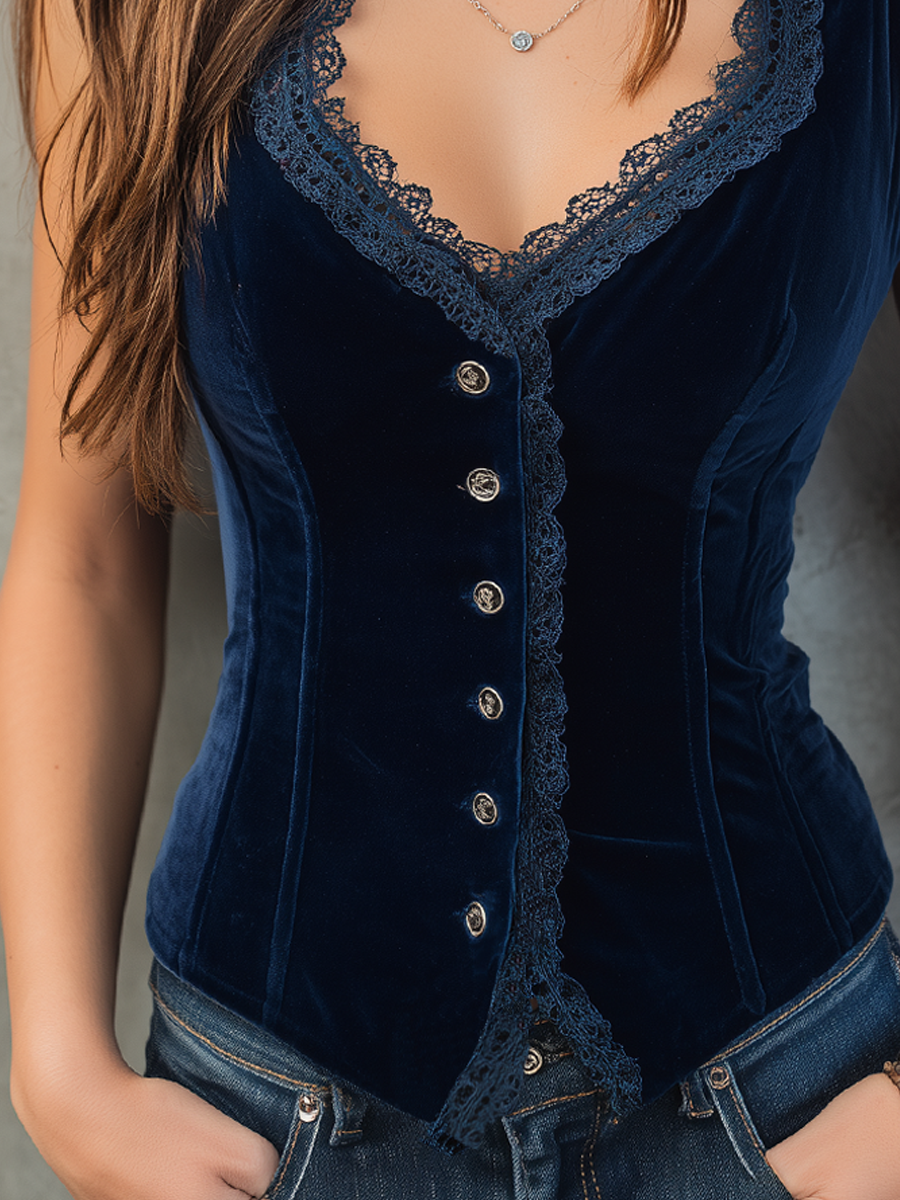 Vintage Velvet Lace Trim Slim Vest