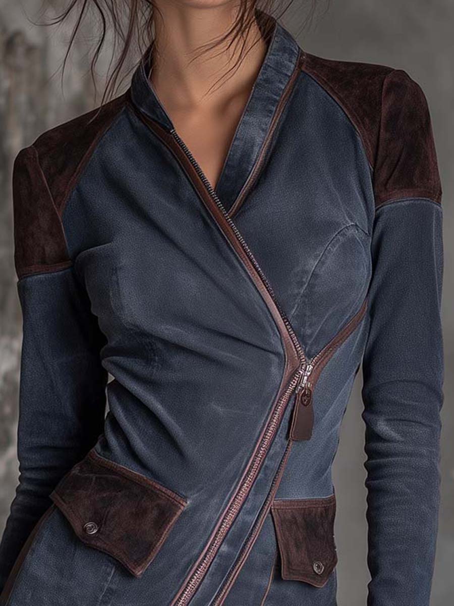 Where moto attitude meets feminine silhouette — this asymmetric zip dress jacket combines washed denim with eco-suede accents in deep espresso tones. The sharp cut and contrast textures bring industrial confidence and tailored elegance together. Designed with a body-hugging fit, angled zipper, and utility flap pockets, it transforms from outerwear to statement dress with effortless style.