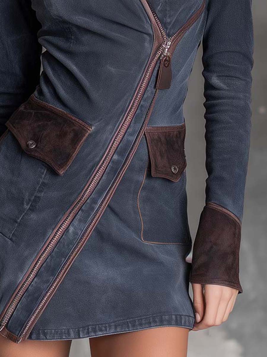 Vintage Washed Patchwork Asymmetrical Zipper Denim Mini Dress