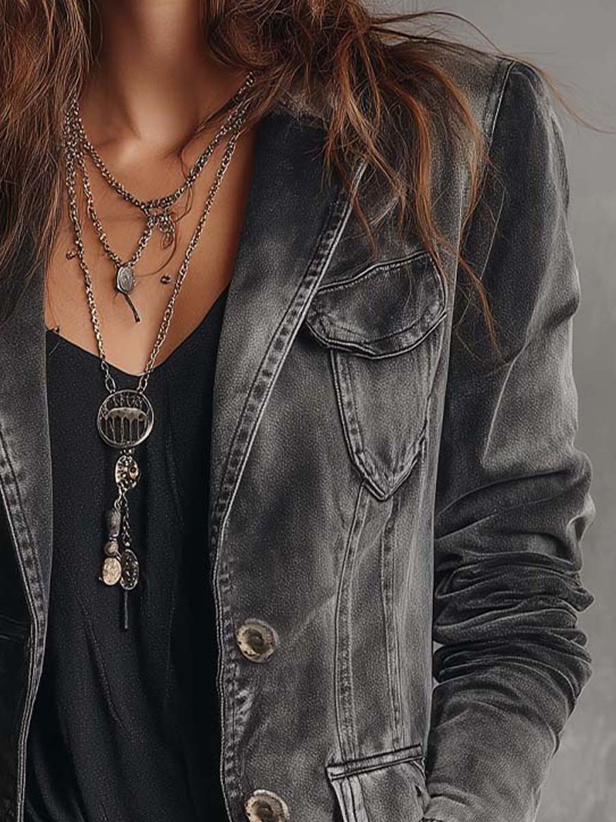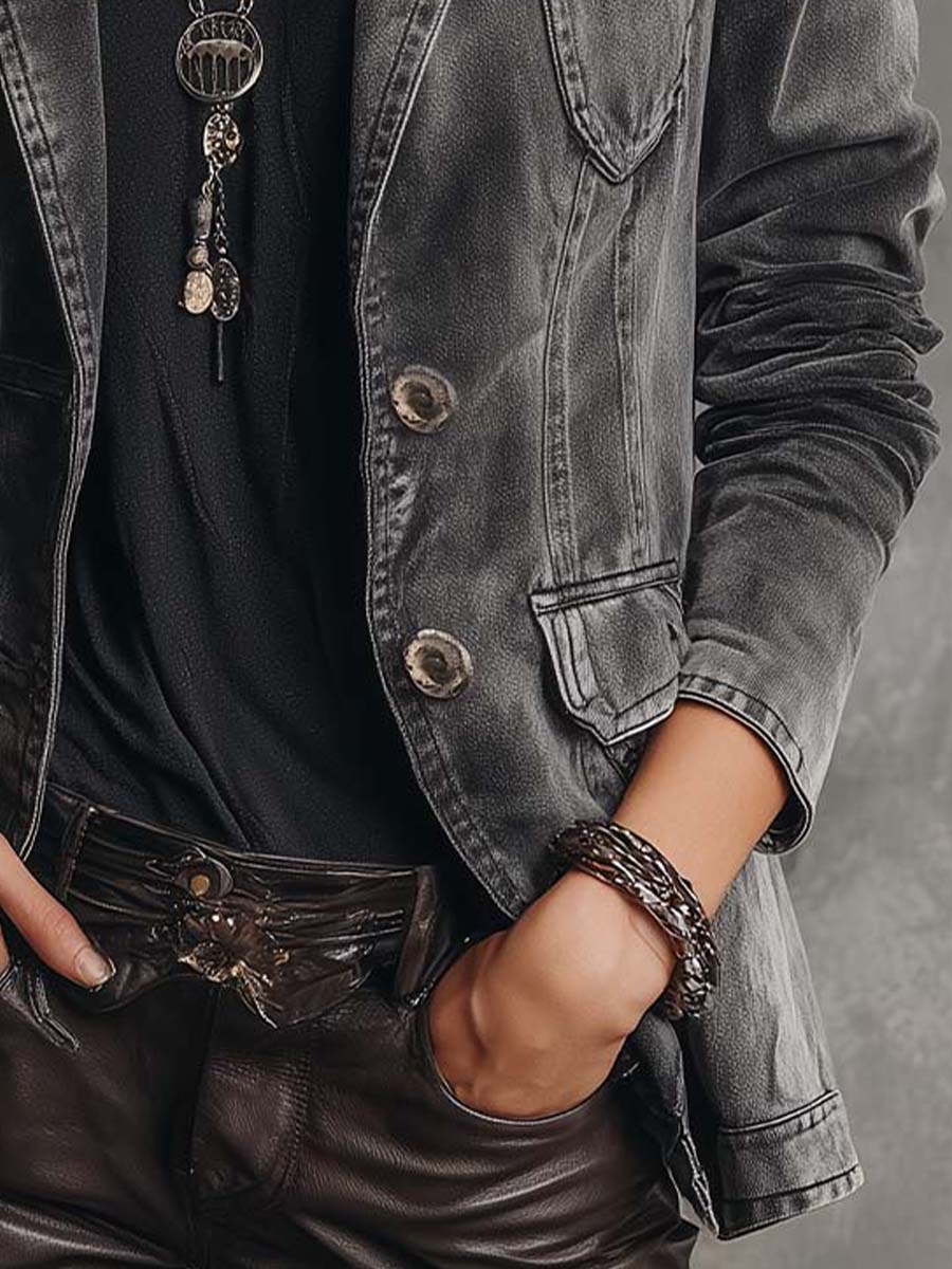 The structured shoulders and tailored silhouette balance the rugged, vintage character with modern refinement. Front flap pockets add a utilitarian twist, while the washed charcoal hue keeps the look versatile, effortlessly pairing with knit tops, eco-leather pants, or layered necklaces for an elevated grunge aesthetic.