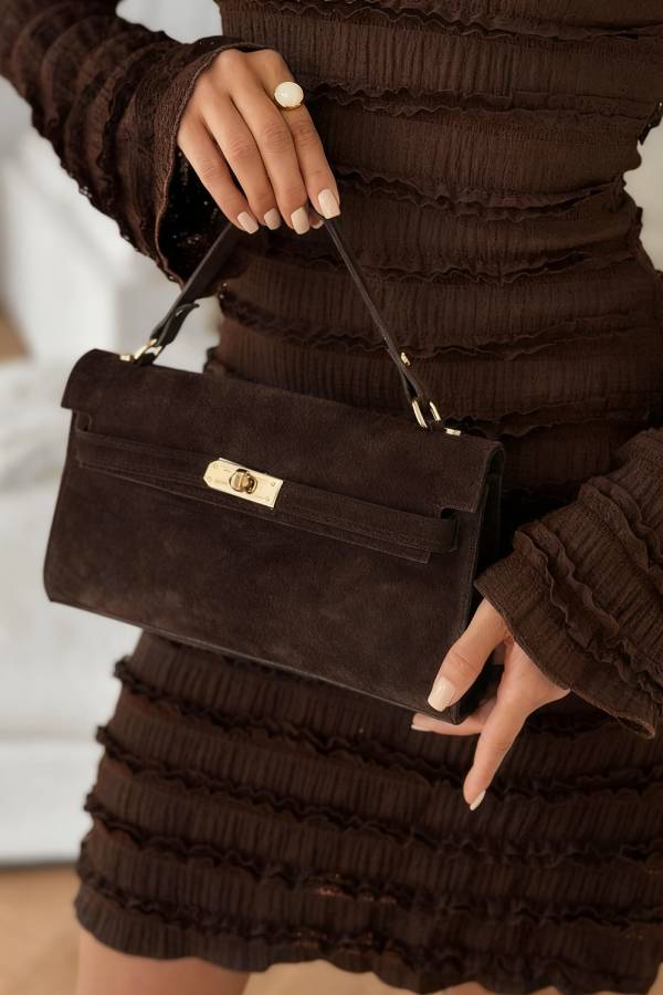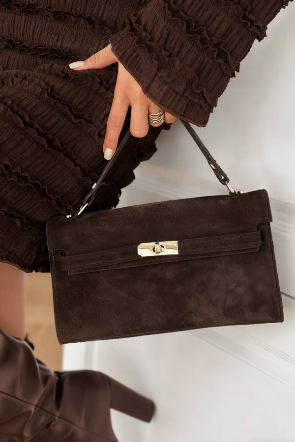 This suede handbag is crafted from high-quality genuine leather. It features a single compartment with a twist closure. It features a handle, an adjustable strap, and a single interior pocket. Gold accents complete the design.