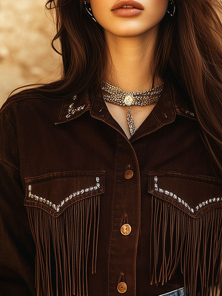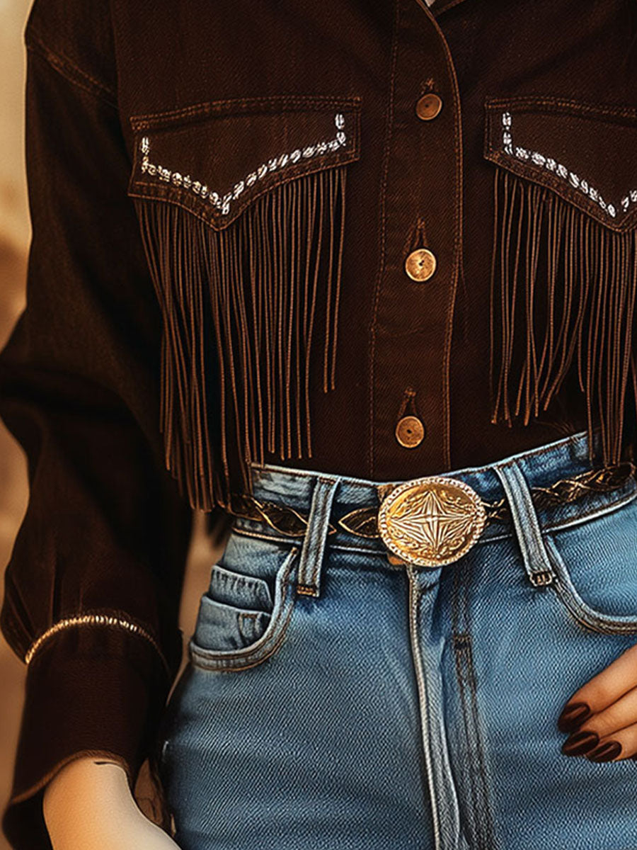 Step into the wild west with this striking Western-Inspired Dark Brown Fringe Shirt. Crafted for those who love to make a statement, this piece is a blend of rugged charm and modern flair. The dark brown hue adds a rich, earthy tone, perfect for any season.