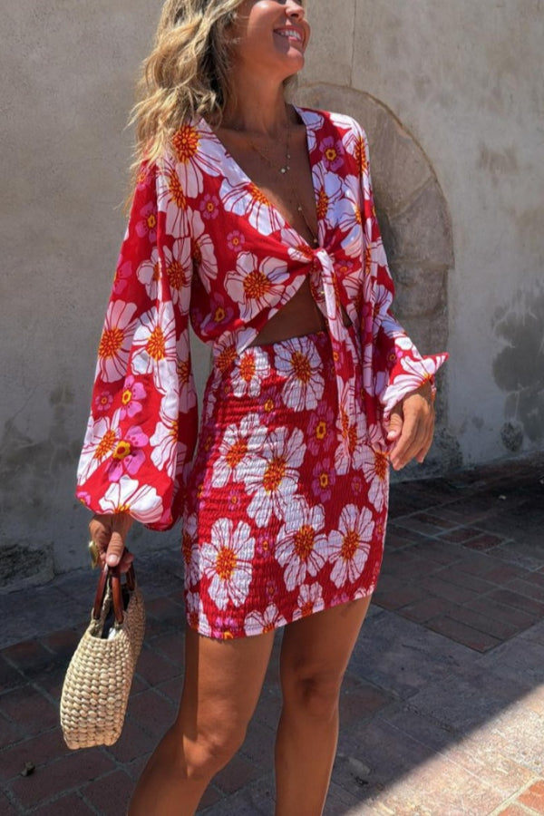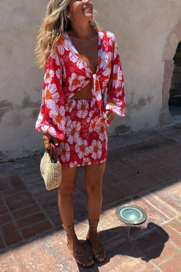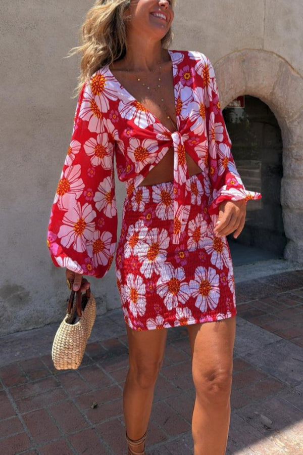 Short dress with a loose-fitting bodice, a tie neckline, and a mini skirt.