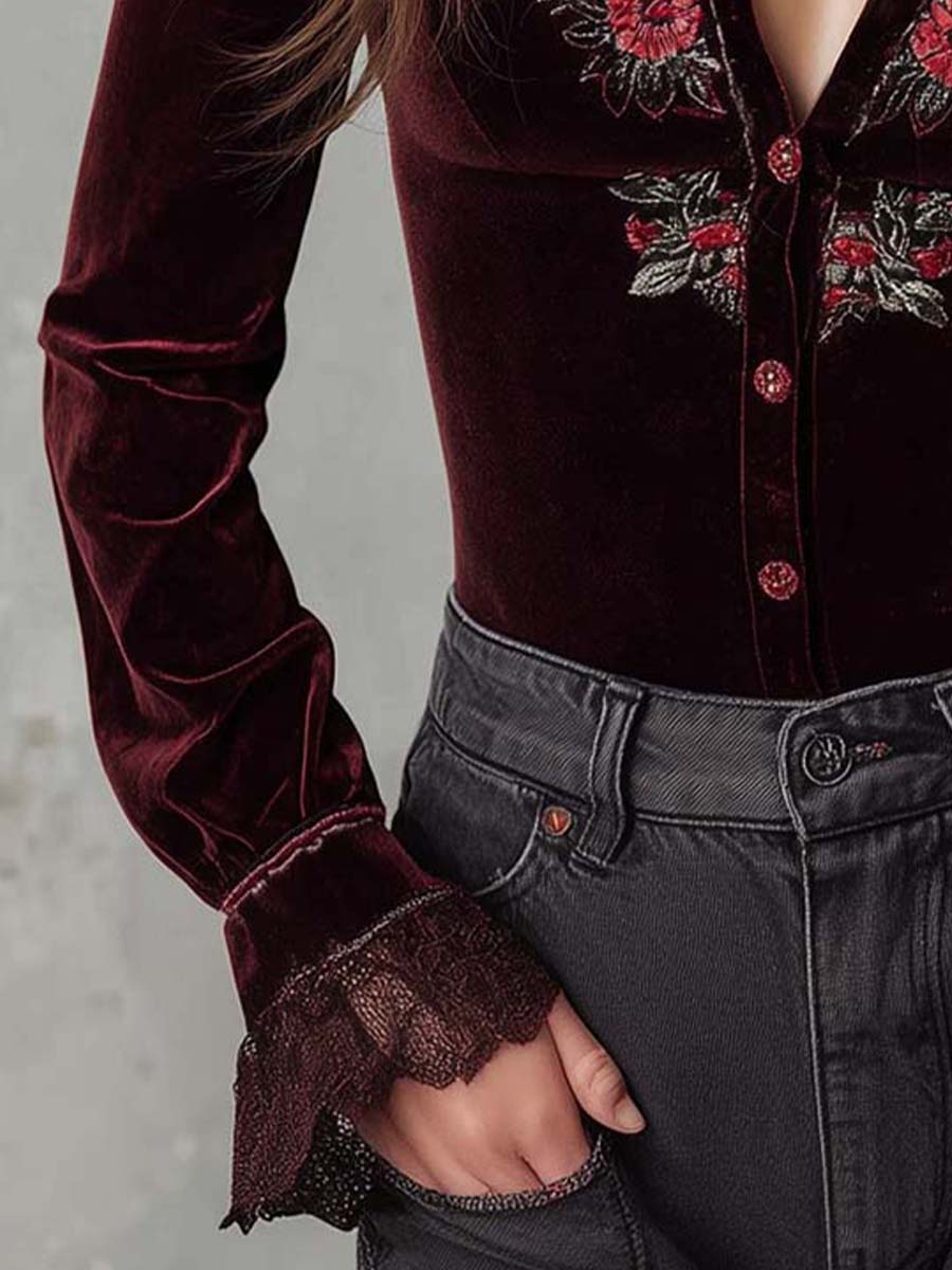 This wine red velvet shirt combines a romantic vintage allure with modern sophistication. Featuring intricate floral embroidery across the chest and cuffs, and delicate lace trim at the sleeves, it offers a refined yet dramatic statement. The fitted silhouette enhances the figure, while the luxurious velvet fabric adds richness and depth, making it a perfect piece for both evening elegance and chic daytime layering.