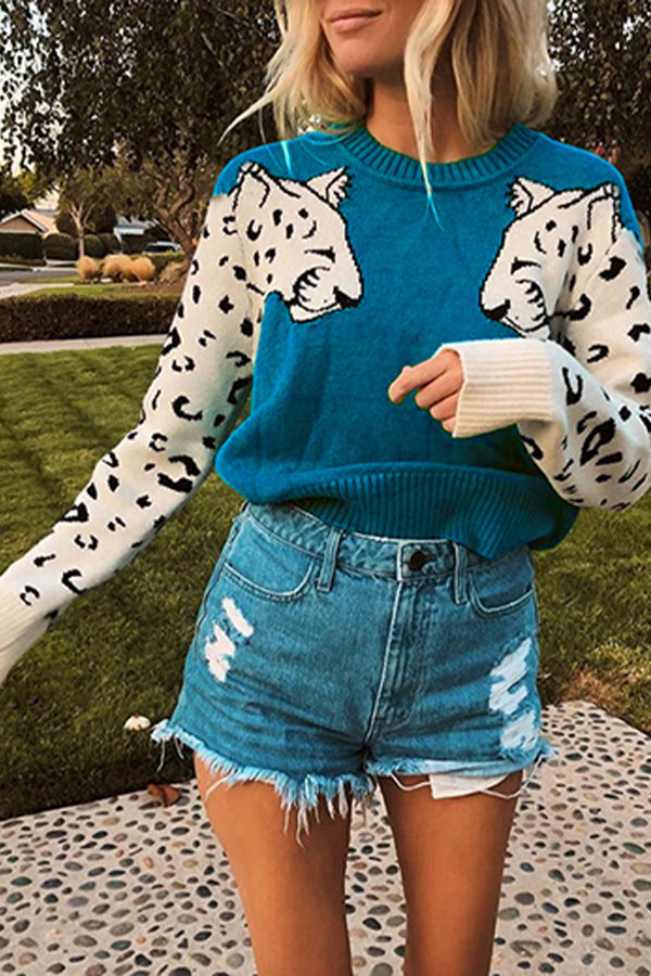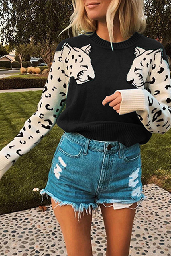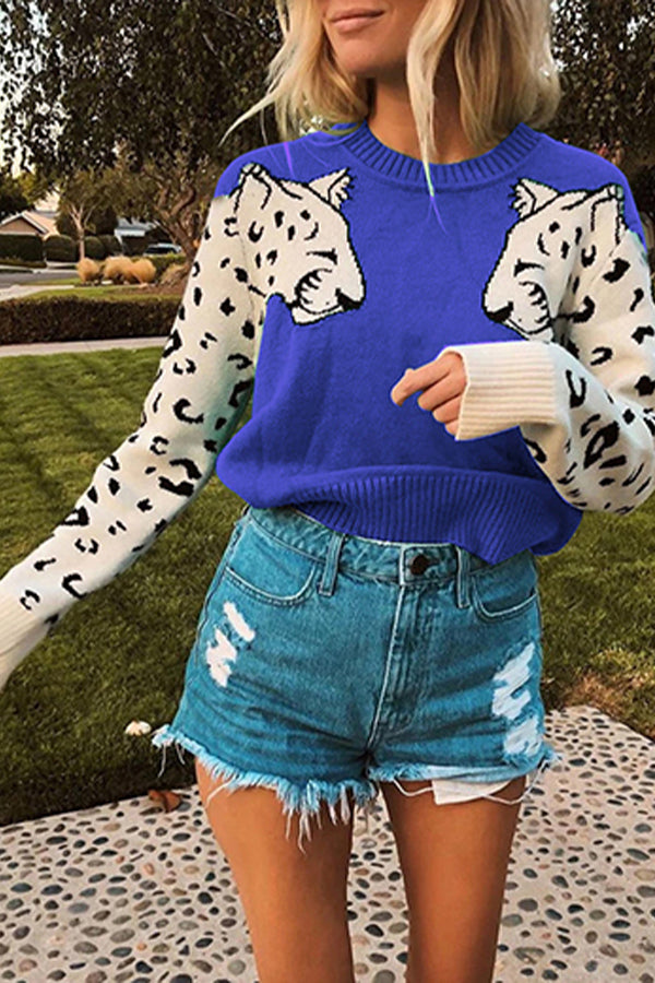 - Features: Leopard Print, Patchwork Design, Long Sleeve, Round Neck, Ribbed Neckline, Cuff and Hem, Knitted Pullover Tops