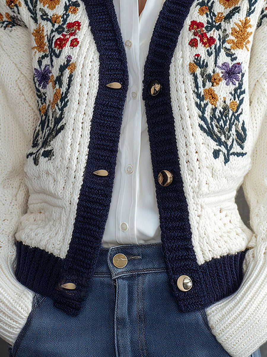 Women’s White Knit Cardigan – Floral Yoke Embroidery & Brass Button Sweater With Navy Collar