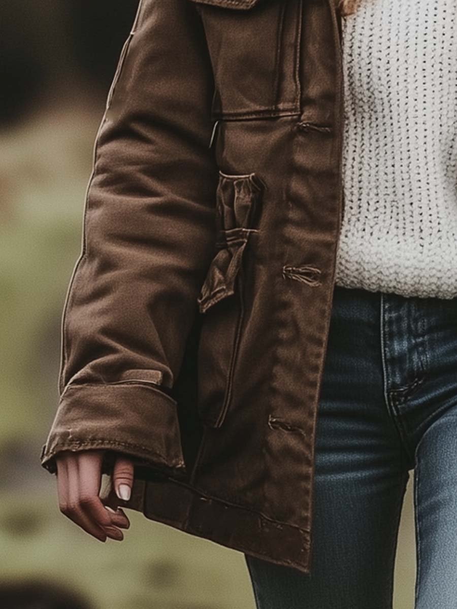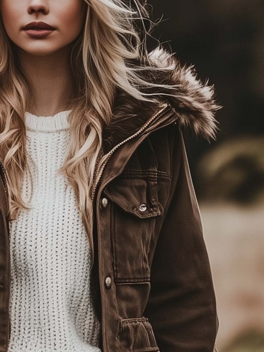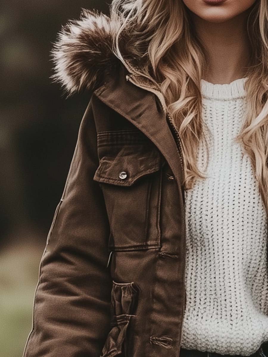 Women's Vintage Fur Hooded Work Windbreaker Jacket