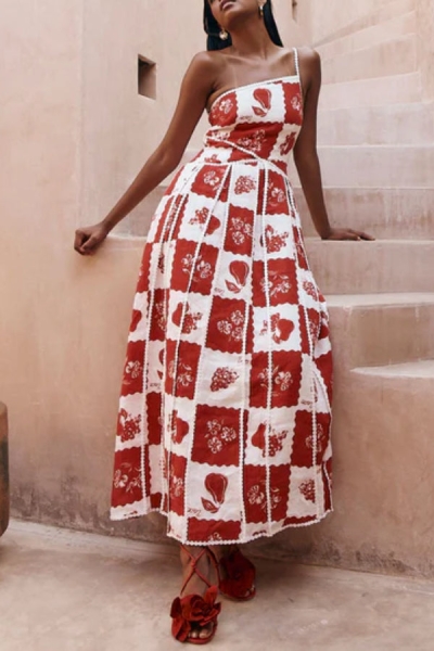 Linen Blend Unique Print One Shoulder Flared Maxi Dress