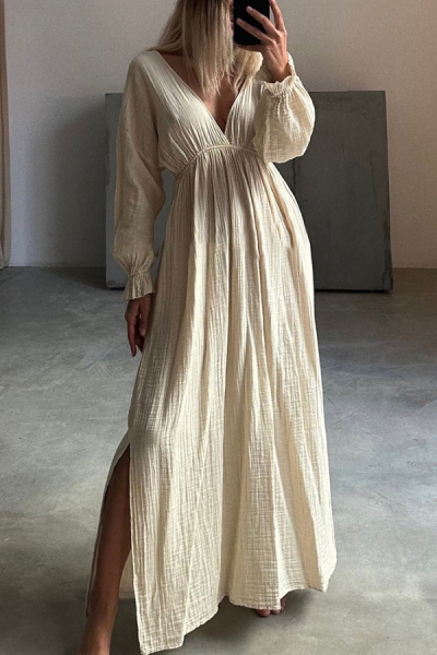 Casual V-neck Slit Cotton and Linen Dress