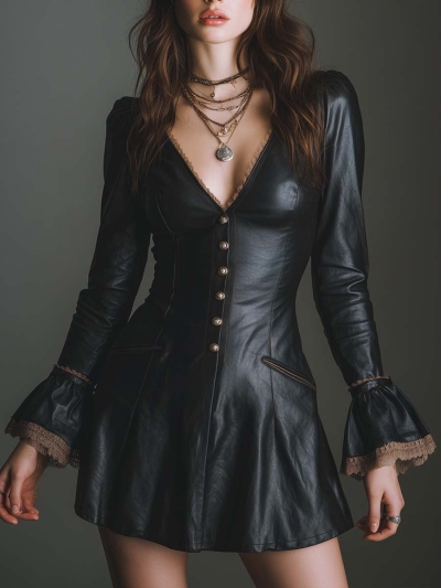 Retro V-neck Button Lace Trim Faux Leather Mini Dress