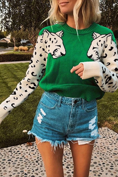 Women’s Casual Leopard Print Knitted Pullover Sweaters Long Sleeve Crew Neck Jumper Tops