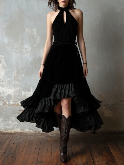 Halter Keyhole Neckline Velvet High-Low Dress With Ruffled Hem