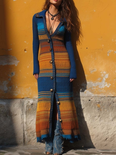 Retro Bohemian Sunset Tone Button-Down Long Sleeve Knit Dress