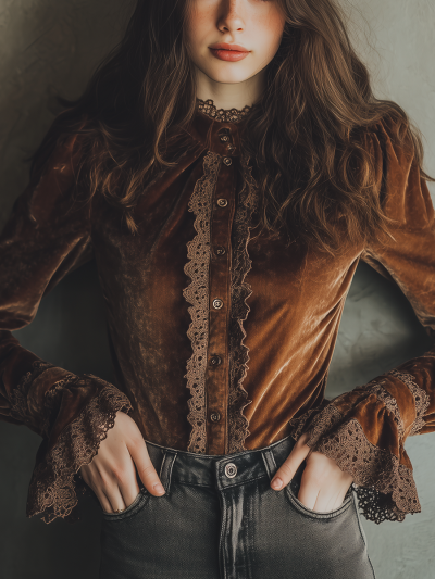 Vintage V-neck Lace Cuffs Poly Velvet Blouse