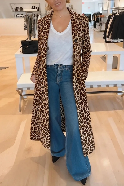 Leopard Print Long Sleeve Pocket Casual Maxi Trench Coat