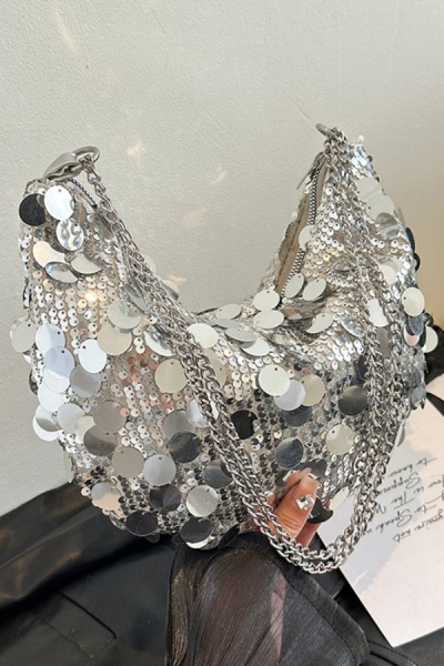 Chain Halter Neck Cutout Irregular Party Glittering Crop Top-Silver
