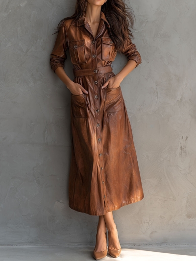 Chic Brown Eco Leather Button-Down Midi Shirt Dress
