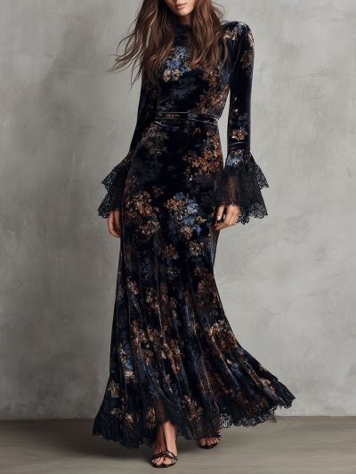 Midnight Floral Velvet Flowing Gown With Lace-Trim Bell Sleeves