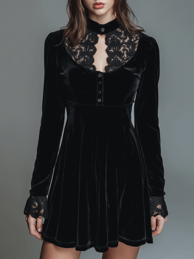 Vintage Black Velvet Lace Collar Mini Dress