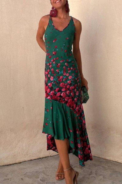 Falling Flowers Printed Back Lace-up Fishtail Stretch Maxi Dress