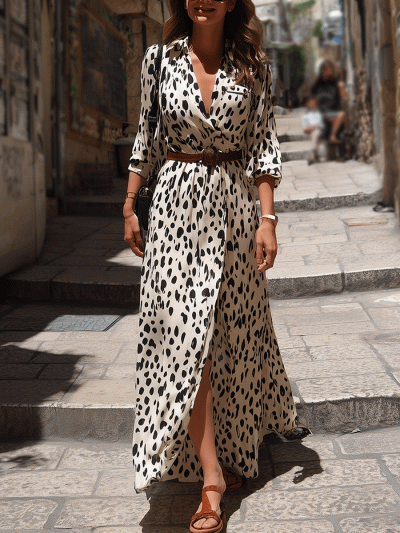 Romantic Belted Slit V-Neck Animal Print Maxi Dress
