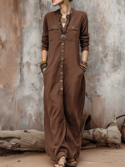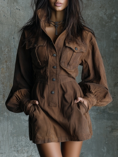 Vintage Distressed Pocket Long-sleeved Shirt Dress
