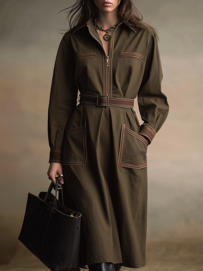 Olive Tailored Structured Zip-Front Utility Midi Dress