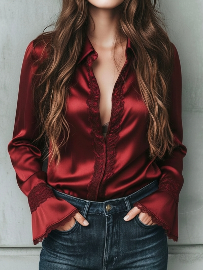 Elegant Burgundy Lace Trim Satin Blouse With Flared Cuffs