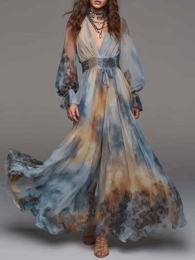 Vintage Tie-Dye Print Balloon Sleeves Flowy Maxi Dress