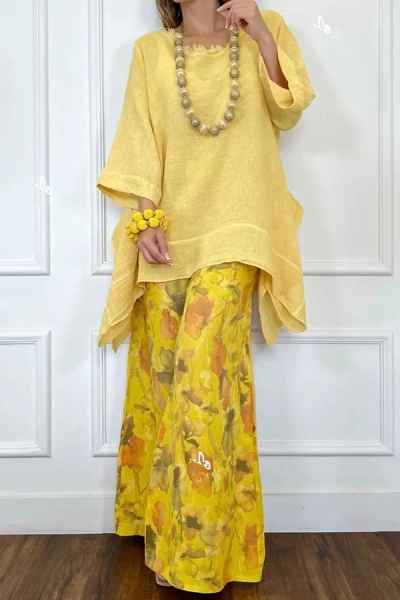 Casual Fashion Printed Wide Leg Pants + Round Neck Top