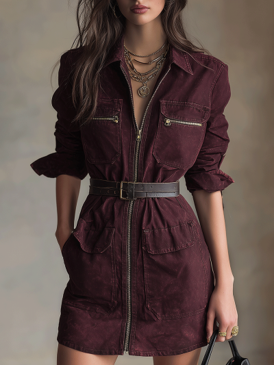 Vintage Burgundy Zip-Front Utility Mini Dress