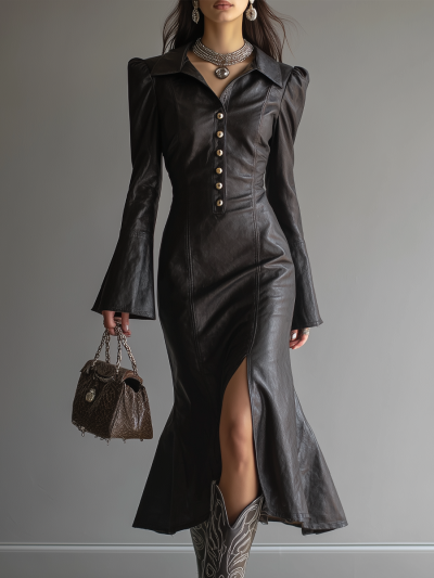 Retro Button Flare Sleeve Eco-leather Midi Dress