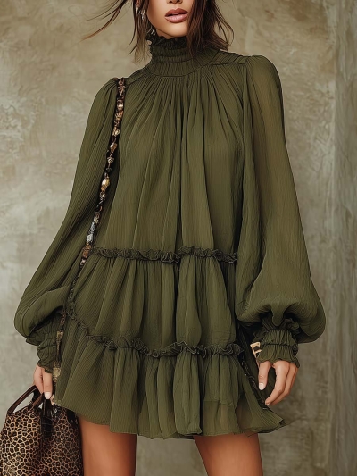 Retro High-neck Ruffled Hem Chiffon Mini Dress