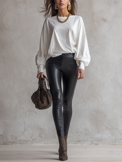Vintage Loose T-shirt And Eco-Leather Leggings Set
