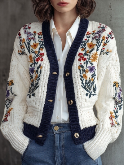 Women’s White Knit Cardigan – Floral Yoke Embroidery & Brass Button Sweater With Navy Collar